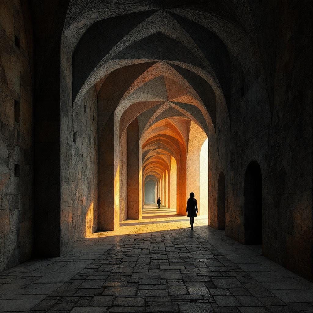 A surreal cityscape rendered with intricate textures and dramatic lighting. The geometric patterns and architectural forms create a mesmerizing and visually impactful scene in a surrealist style.