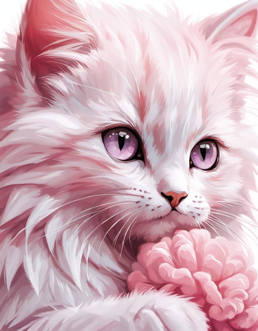 This adorable digital painting captures a sweet moment of a cute pink kitten cuddling a pink teddy bear in a soft, white background, with visible brushstrokes and a charming atmosphere.