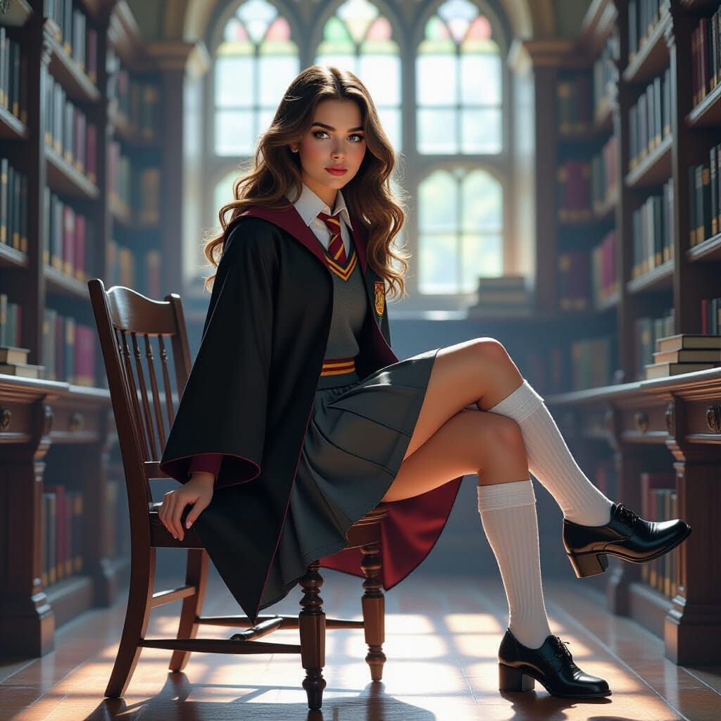 A hyperrealistic image of Hermione Granger in a library, wearing a Hogwarts uniform and white socks, with one leg resting on a chair, featuring dramatic lighting and intricate detail.