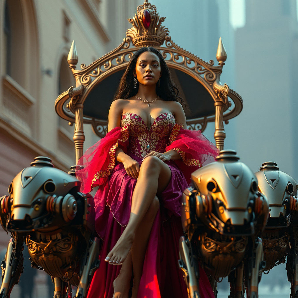 This image shows a beautiful Brazilian woman in a futuristic gown riding a chariot. The image is designed with cinematic lighting and rich film textures, creating an otherworldly sci-fi aesthetic.