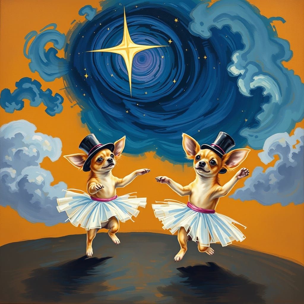 This vibrant gouache painting depicts two adorable chihuahuas dancing under a starry night sky, surrounded by swirling clouds of blue and purple, in a dynamic and joyful scene reminiscent of vintage impressionist masterpieces.
