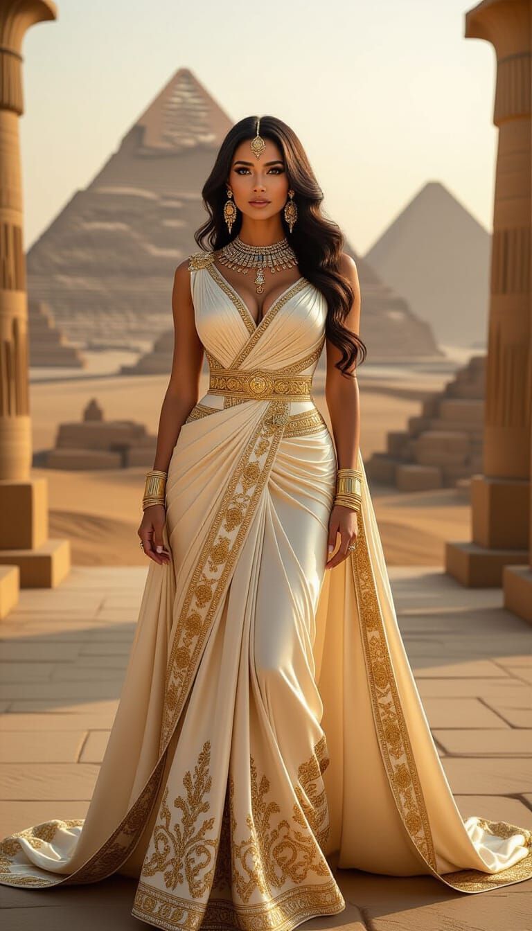 A striking image of a curvy goddess in a golden gown, standing before Egyptian temples. The portrait features cinematic lighting and captures a regal aura in a highly detailed, realistic style.