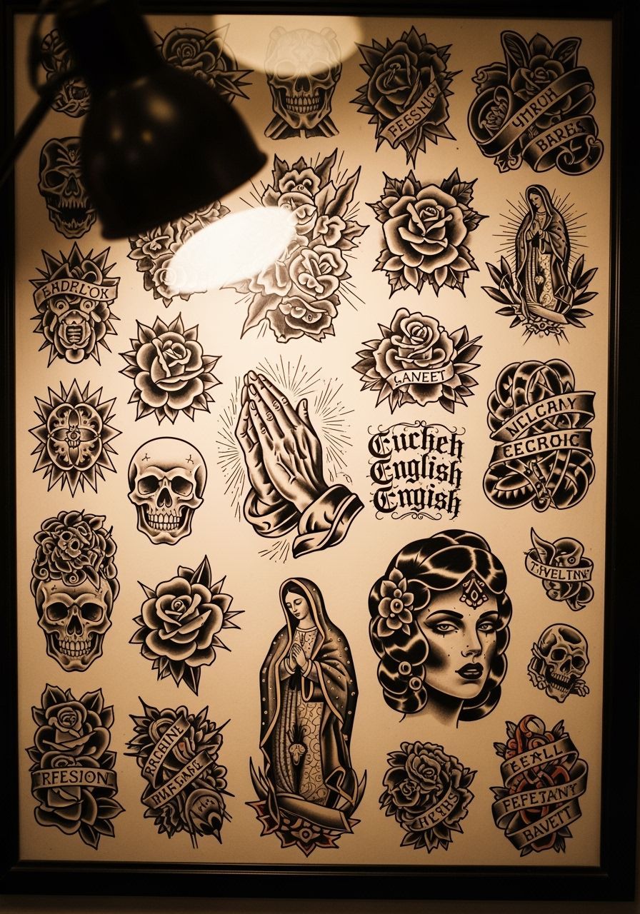 Design your own Chicano-style tattoo art! Our AI image generator lets you create unique tattoo flash sheets and designs for free.