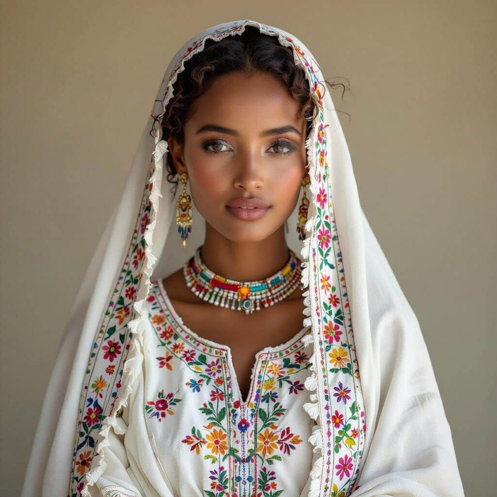 This image shows an Ethiopian woman in a traditional white Habesha dress. Intricate embroidery and vibrant accents define this cultural garment, rendered with soft lighting and delicate textures.