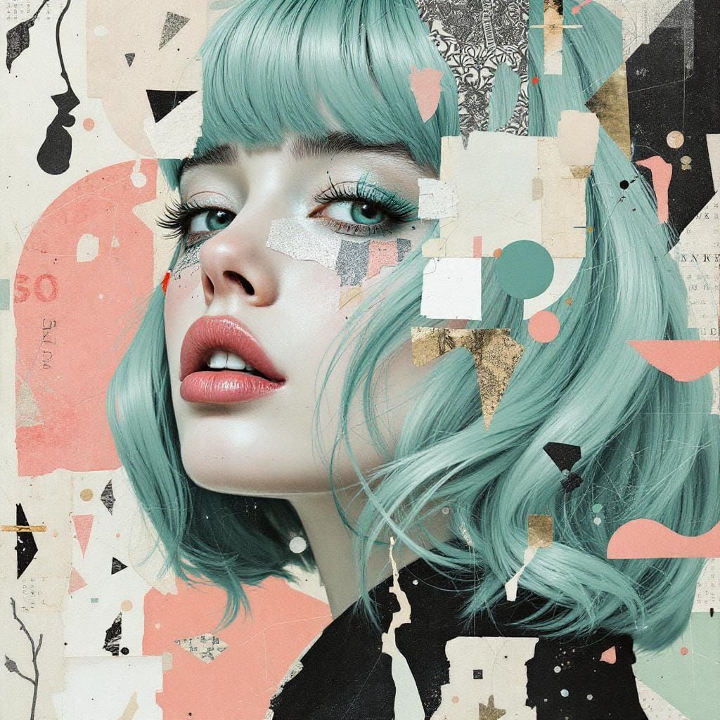 This image shows a woman with mint green and pale blue hair in a mixed media collage. The artwork features vintage paper textures, torn magazine fragments, and a muted color palette in a contemporary mixed media art style.