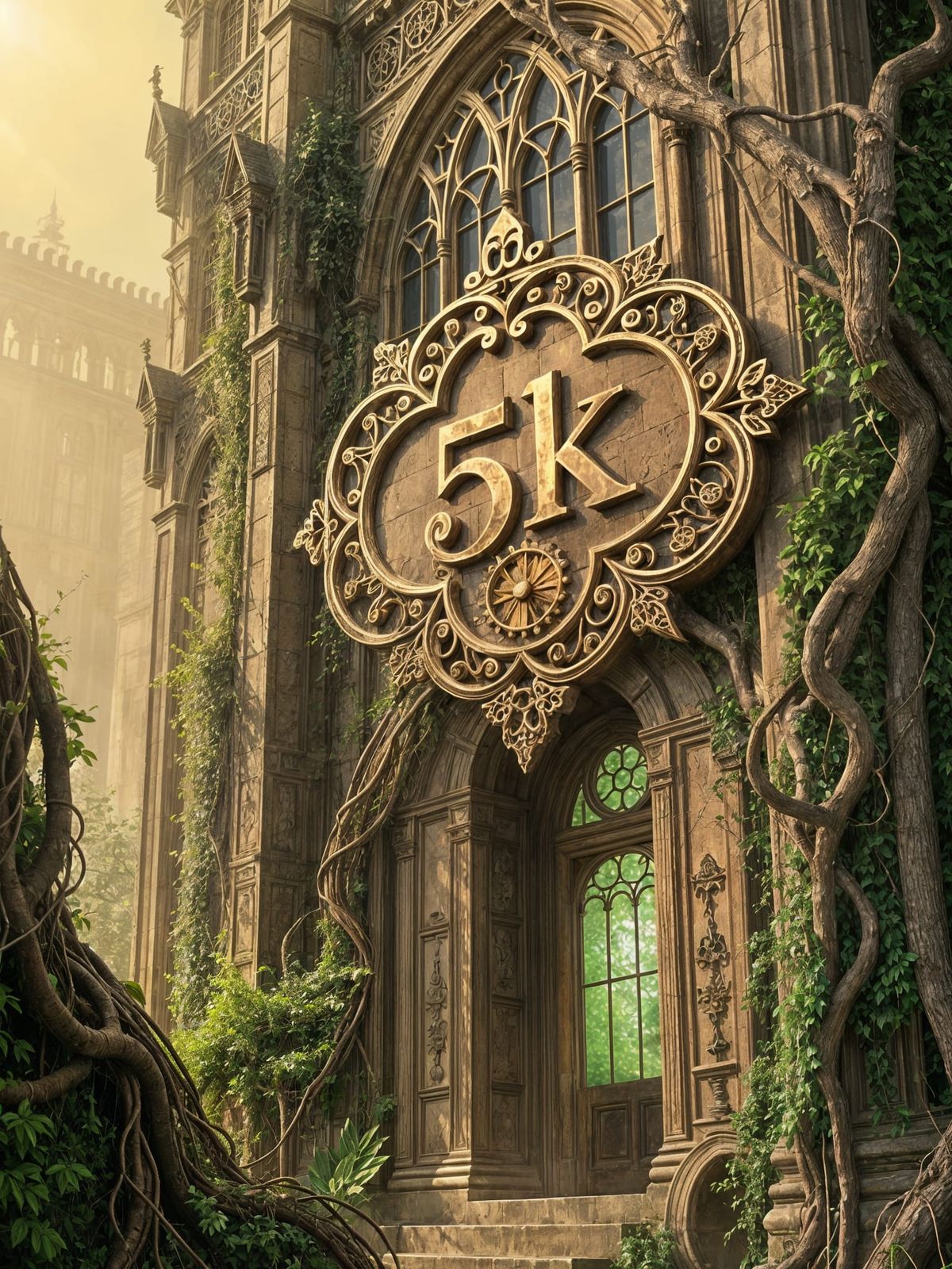 This image features elegant, overgrown gothic architecture with a steampunk "5k" sign. It showcases intricate details, gears, vines, and contrasting colors, illuminated by dusty sunbeams.