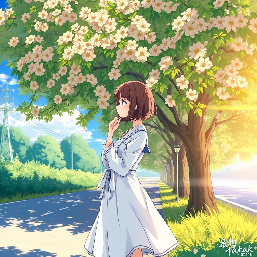 This image shows a girl in anime style picking a flower from a tree. The artwork has a dreamy, soft aesthetic, reminiscent of classic anime scenes.