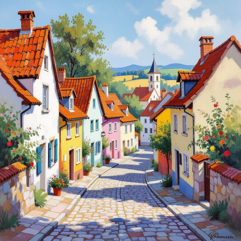 A whimsical village with colorful houses and cobblestone streets. This artwork blends watercolor techniques with cinematic stylization, creating a mesmerizing fairytale scene.