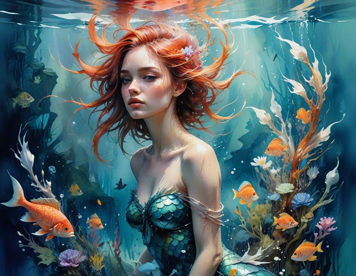 A digital watercolor of an underwater shop run by mermaids. The artwork features bioluminescent fish and kelp, creating a scene of lost civilizations and oceanic dreams. The art is stylised with expressive watercolour techniques.