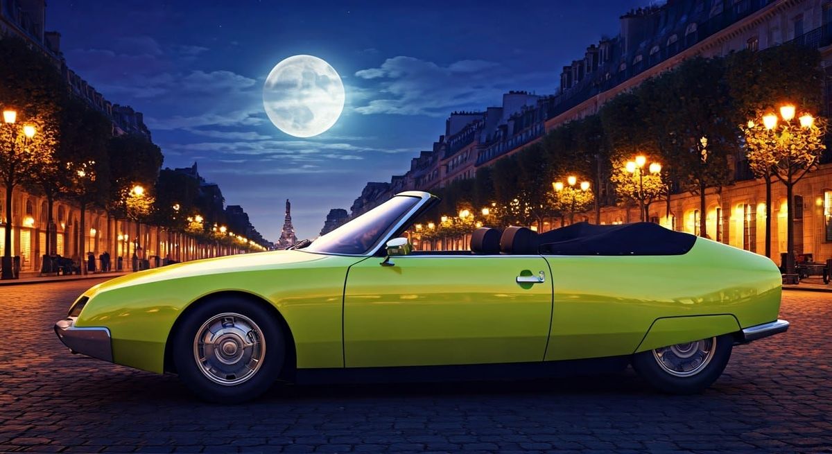 A stunning image of a lime yellow Citroën CX airdream drophead, set against a moonlit Parisian night sky, with a focus on the car's sleek design and vibrant color palette, blending elements of hyper-realistic concept art and colorful digital painting