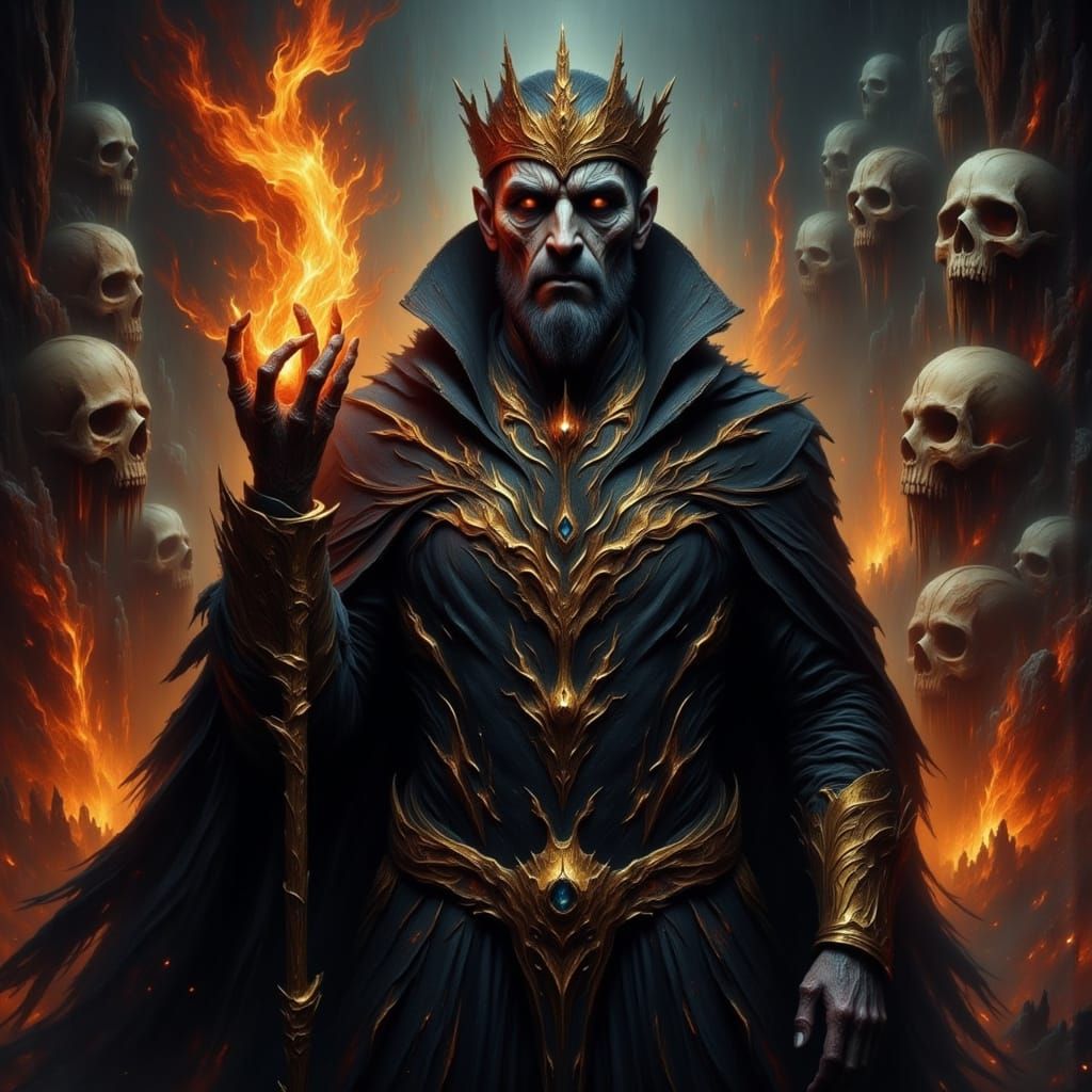 This image depicts a menacing Emperor in a dark uniform with golden details. The scene is grim and foreboding, featuring a scorched background, skulls, and a golden crown, creating a horror-themed atmosphere.