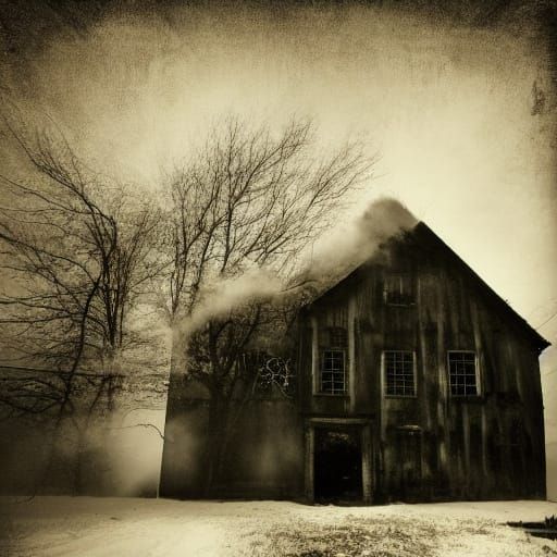 A moody, high-contrast black and white photograph capturing a goth model in an abandoned house, with a rusted iron sculpture and dark, foggy atmosphere.