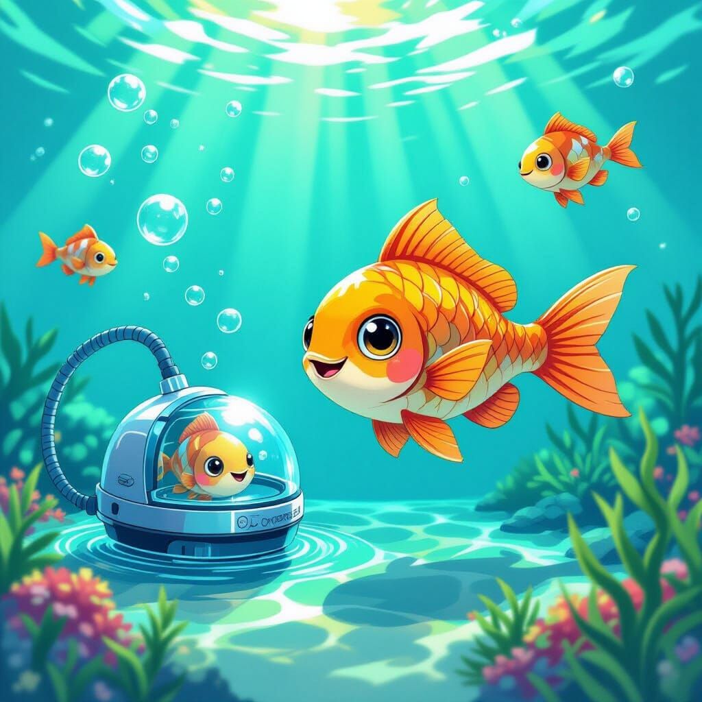 A charming illustration of smiling cartoon fish swimming with a robotic cleaner in clear, sunlit water. Features vibrant colors and intricate details, creating a sense of wonder.