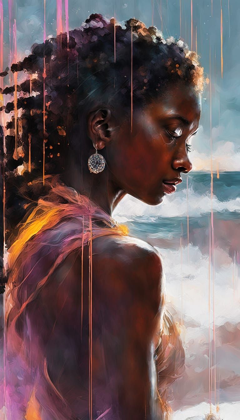 This image shows an African woman in a winter seascape during a snowstorm. It is a highly detailed portrait in the style of a watercolor painting, with winter tones and neon lighting.