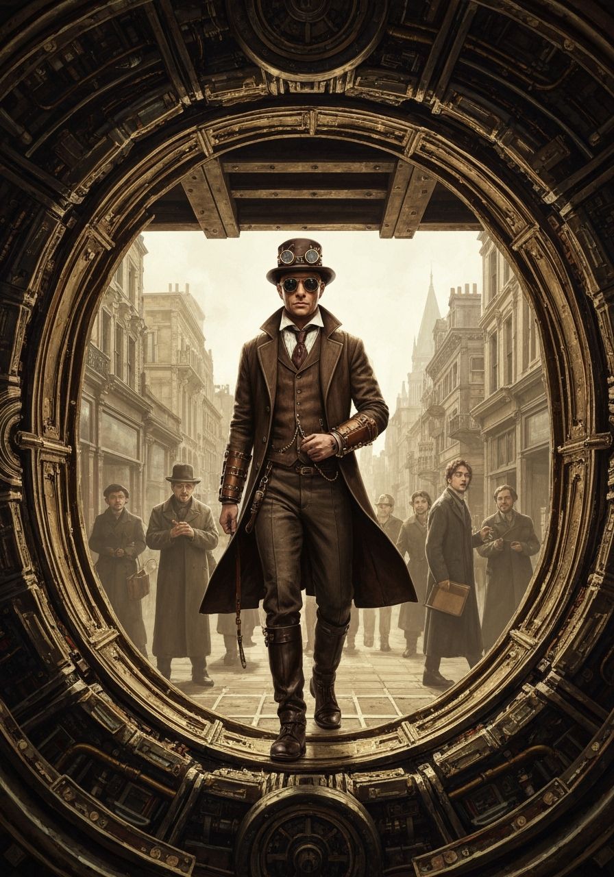 A steampunk time traveler with goggles and pocket watch stands inside a futuristic time machine amidst surprised citizens in a Victorian-era city. The image has a detailed, futuristic aesthetic.