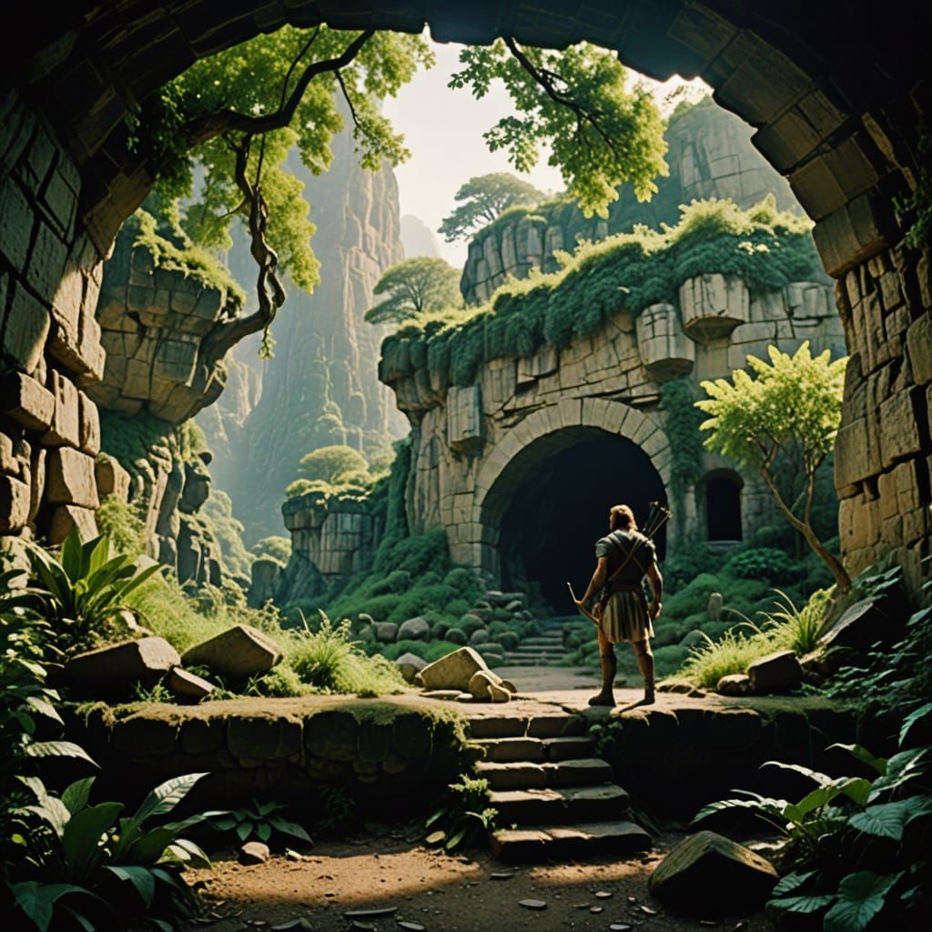 This cinematic film still captures the moment when Chiron, the wise centaur, teaches archery to young Hercules outside his cave. Shot on 35mm film with warm, golden lighting, the scene evokes a nostalgic atmosphere, with earthy tones and muted greens complementing the rustic landscape.