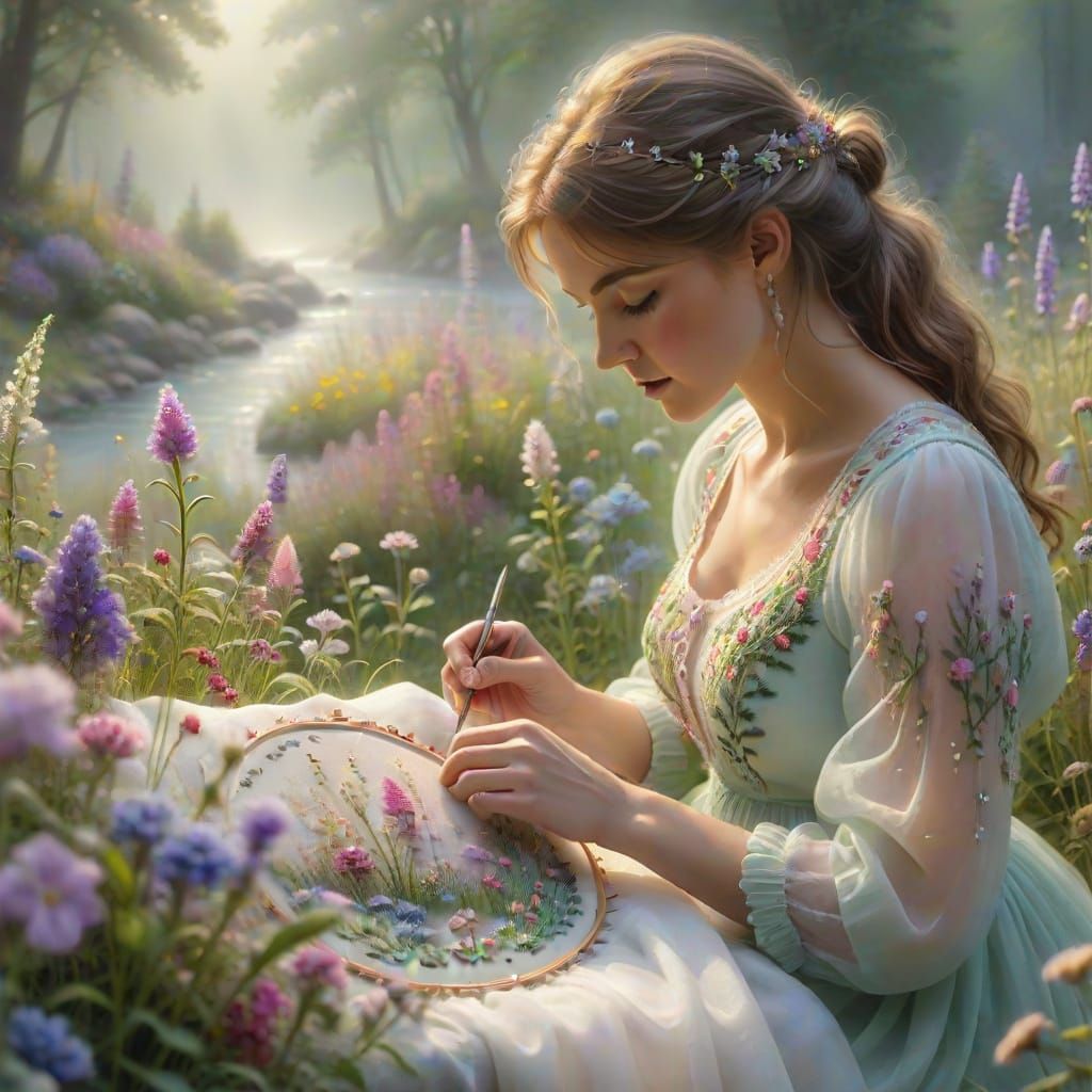 This image shows a person focused on intricate hand embroidery in a misty wildflower garden. Gentle sunlight filters through the mist, creating a glowing, dreamlike atmosphere.