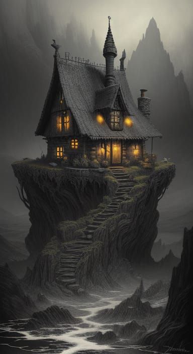 A detailed image of a whimsical rustic cottage in a rural setting. The black ink drawing features intricate textures and evokes a surreal, fantastical atmosphere in the style of classic illustrators.