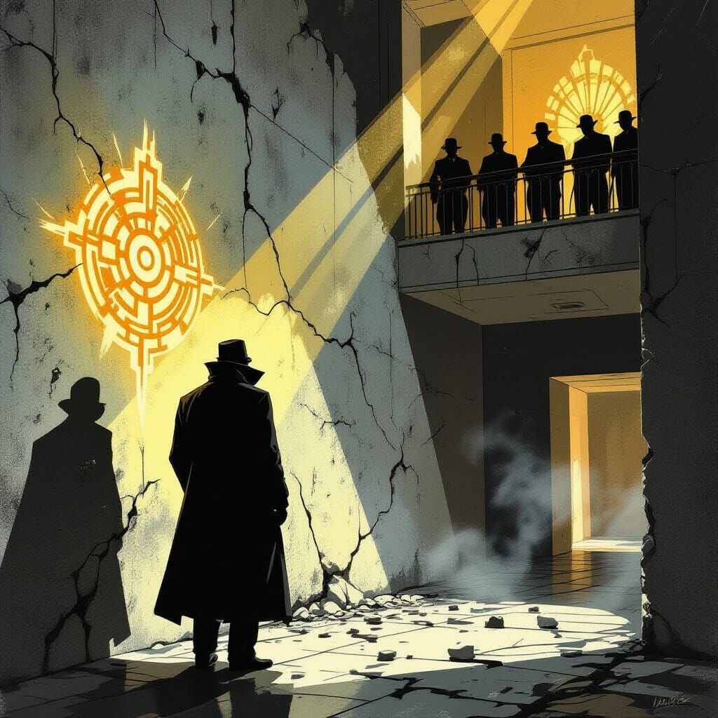 A striking picture of a figure in a trench coat gazing at a symbol on a wall. Golden light illuminates the scene, with shadowy figures watching from above in this pulp illustration.