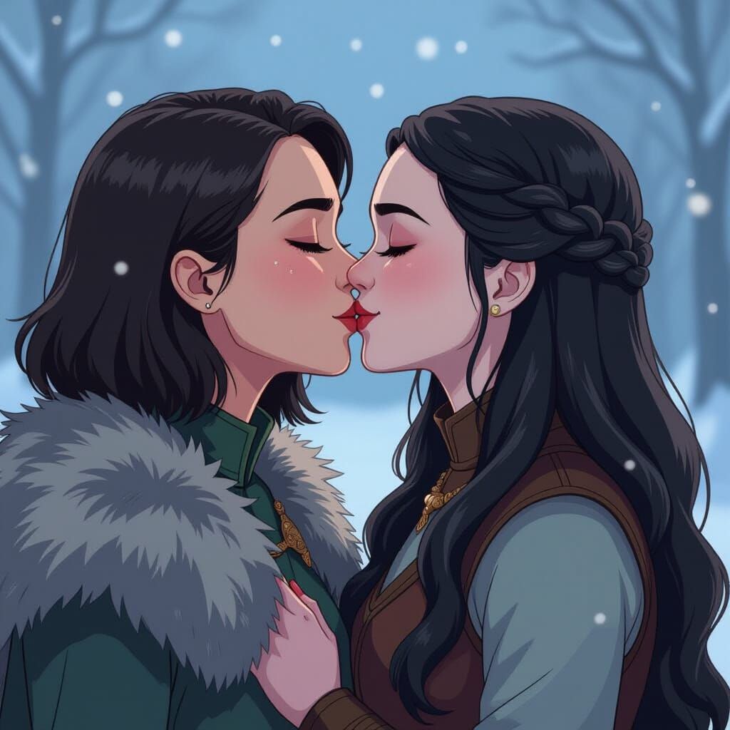 This image shows Arya Stark and Shireen Baratheon in a romantic, close-up kiss. This manga-style image has cinematic lighting, deep color and cel-shading, reminiscent of Studio Trigger's anime artwork.