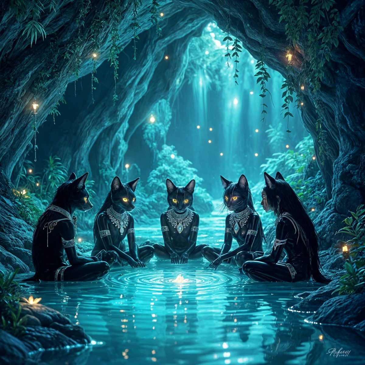 This image shows a hidden grotto illuminated by bioluminescent flora, where feline humanoids gather around a pool. The scene blends soft brushwork with futuristic design, creating an elegant, psychedelic and surreal atmosphere.