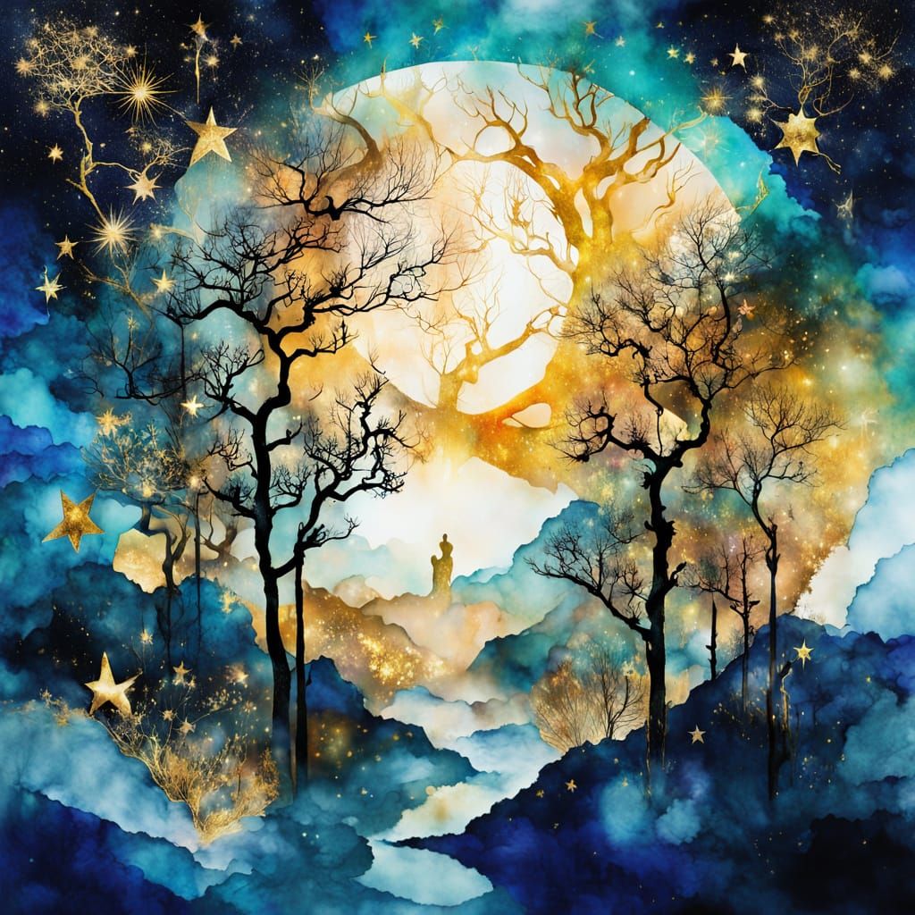 This image features a surreal forest in a double exposure silhouette, rendered with delicate gold outlines and luminous twilight colors. It combines Chinese watercolor and alcohol ink techniques.