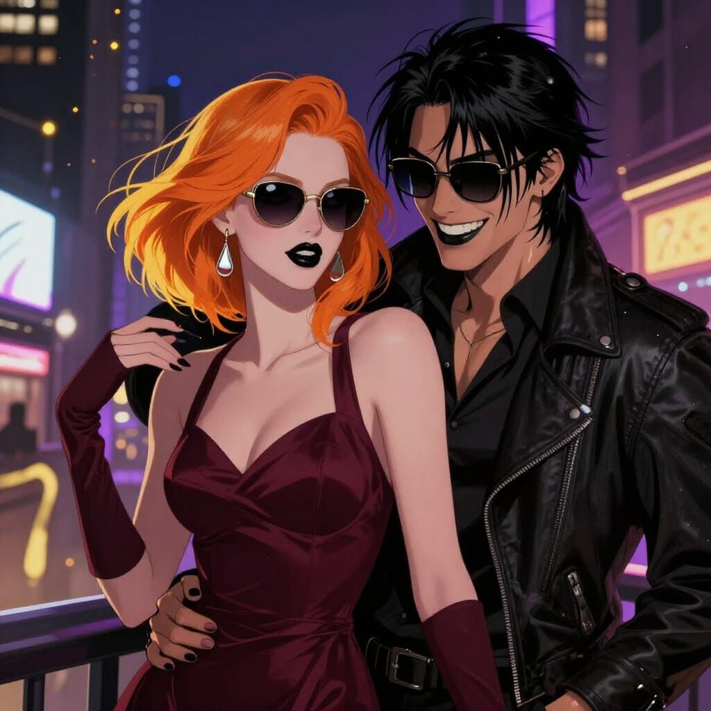 A striking image of a stylish couple celebrating New Year's Eve in New York City at night. This artwork features dynamic lighting and deep colors in a dark fantasy concept art style.