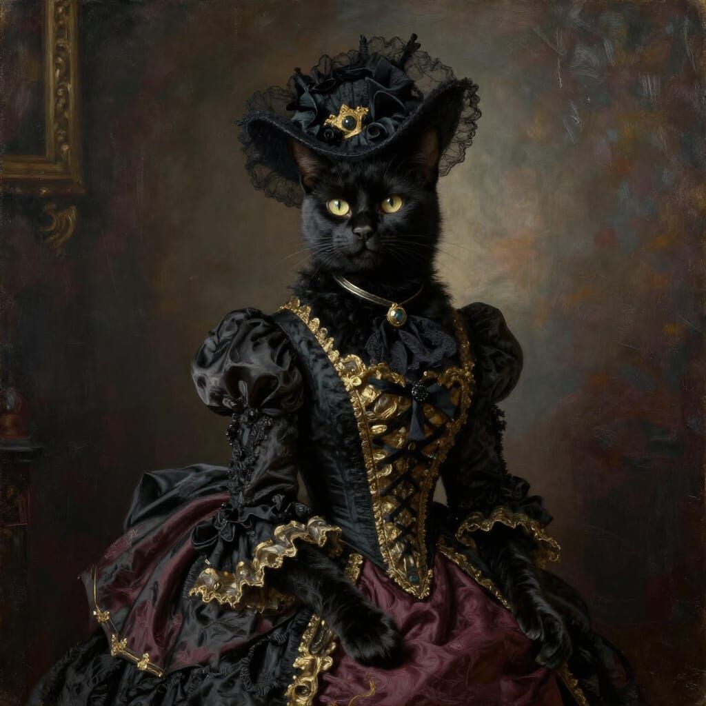 This image shows a black cat dressed as a Victorian lady in an elegant, muted dress and hat. Rendered as an oil painting, it evokes mystery and historical charm with dramatic lighting.