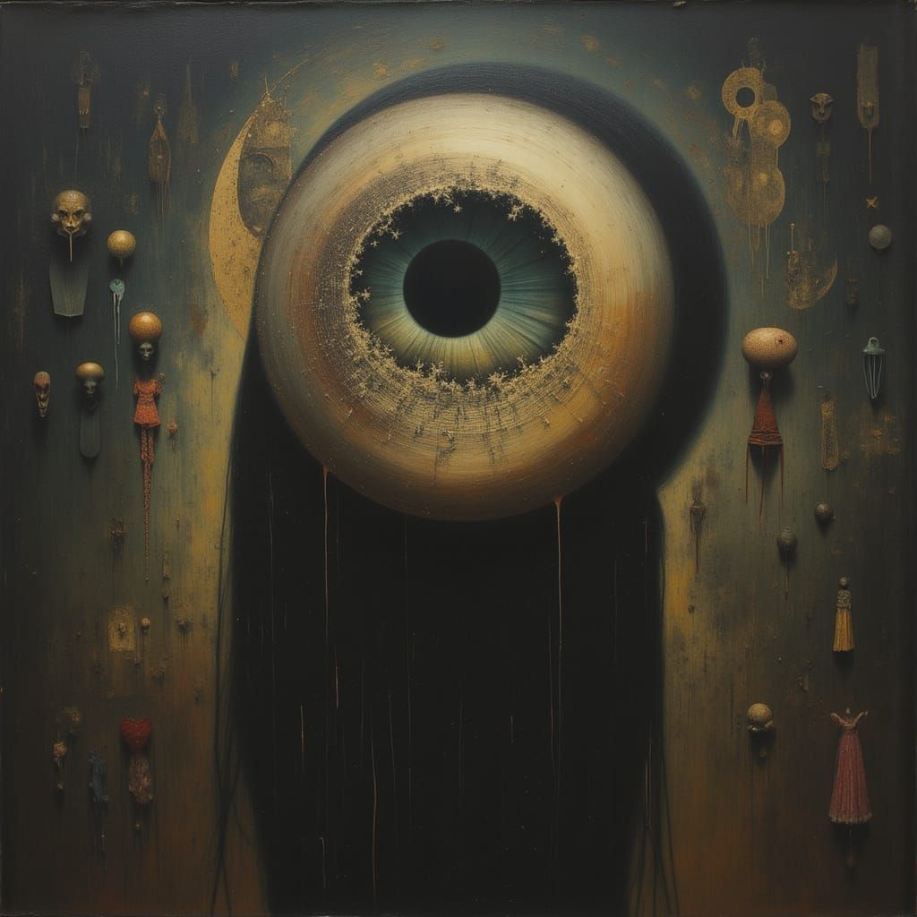 Do not let the darkness cling to your eyes. Intensely surreal imagery and atmosphere, hypnagogia, clarity within distortion, existential, liminal, clinical depression, psychosis, dissociation, a mixture of 20th century Surrealist influences, Rembrandt lighting, rich textures, oil on canvas. <lora:Ad70s:1.0> ...