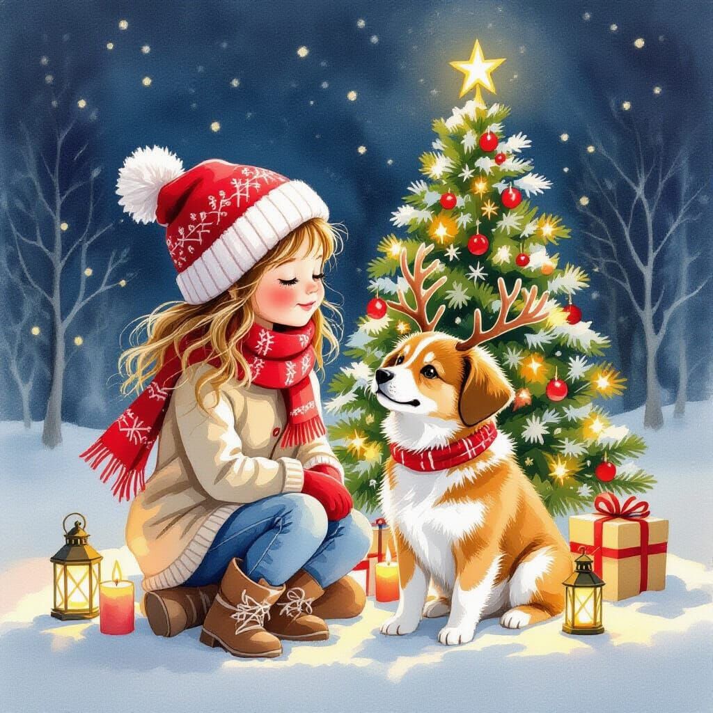 A lovely girl wearing a Santa hat with her dog, adorned with reindeer antlers, sits by a Christmas tree. Soft, gentle lights and candles create a warm atmosphere in this watercolor style image.