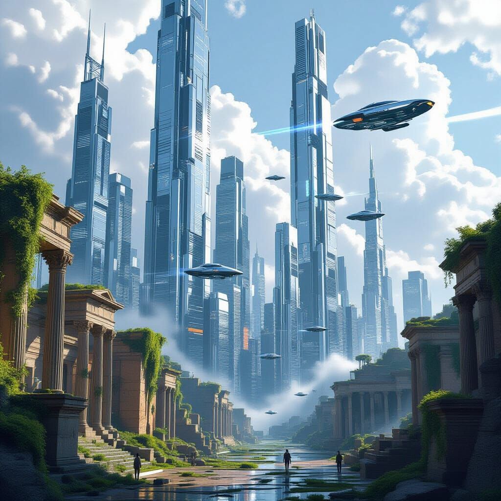 This image shows a futuristic city blending chrome skyscrapers with vine-covered Roman ruins. Flying vehicles traverse the space between eras, set against dramatic lighting and vibrant colors, reminiscent of a cyberpunk aesthetic.