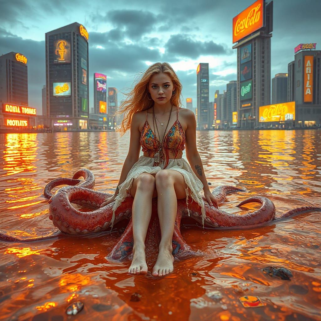A striking image of a luminous woman with golden hair on a colossal squid adorned with graffiti. Surreal neon cityscapes and a sparkling soda ocean create an otherworldly scene.