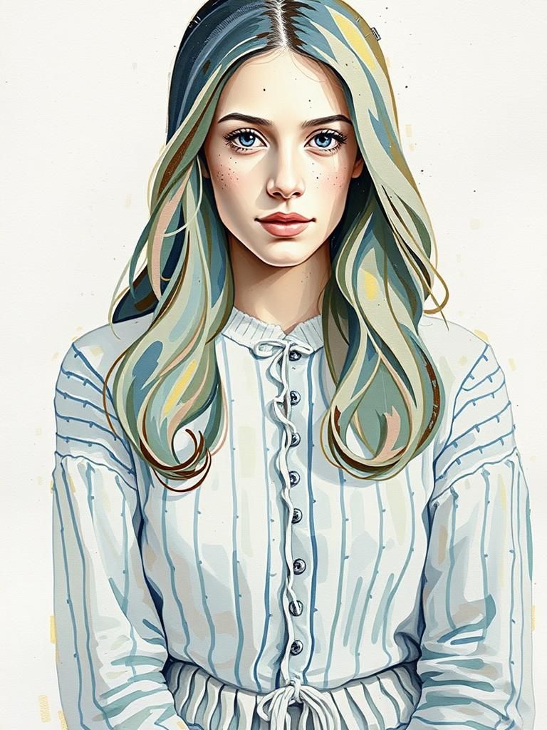 A striking picture of a young woman with freckles and blue eyes, smiling confidently. The portrait is softly lit with a warm, intimate background and rendered as an impasto painting.