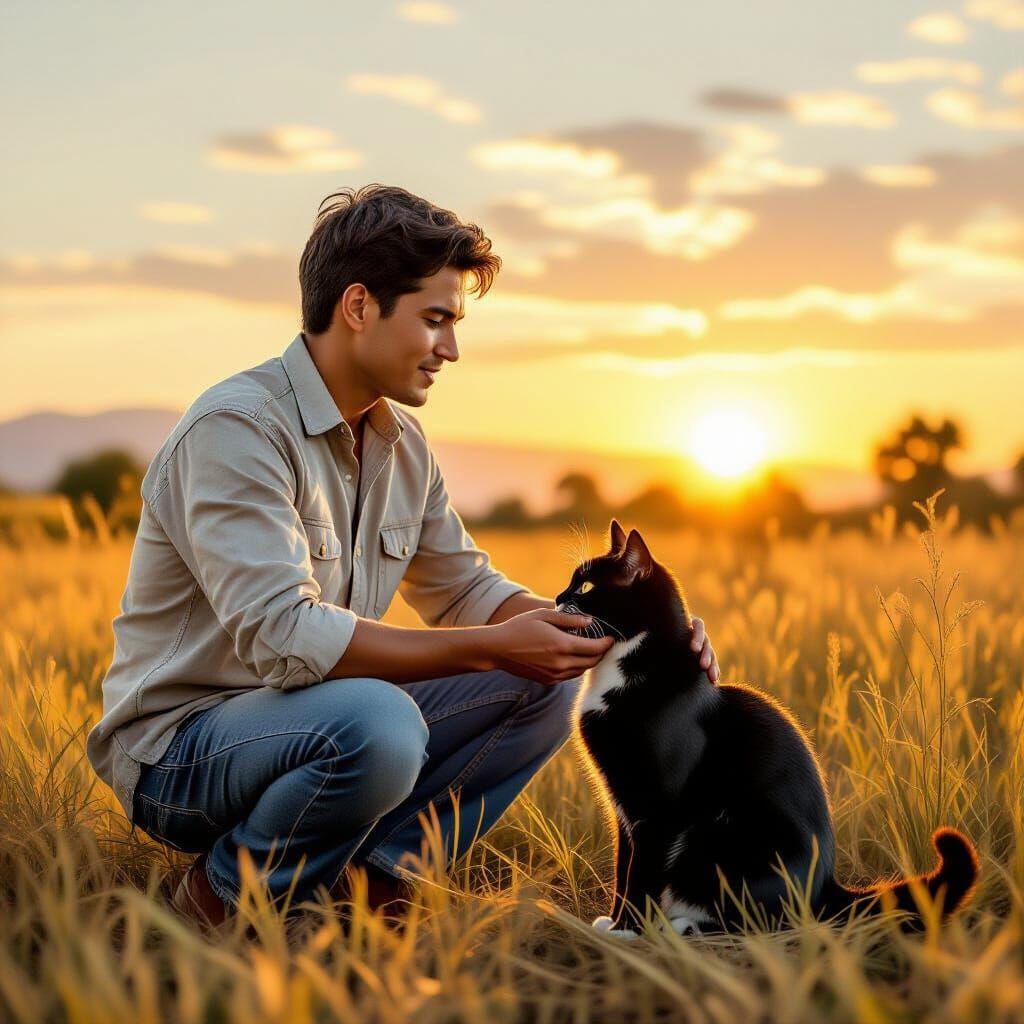 A tender scene of a Bolivian man with a rectangular head kneeling in a field, holding his black cat's paw. Oil painting style with vibrant colors captures a magical golden sunset glow.