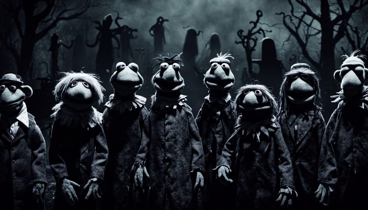 This image shows seven undead puppets in a gothic art style, standing together in a misty graveyard. The dark fantasy illustration features tattered felt textures and glowing eyes, under moody lighting.
