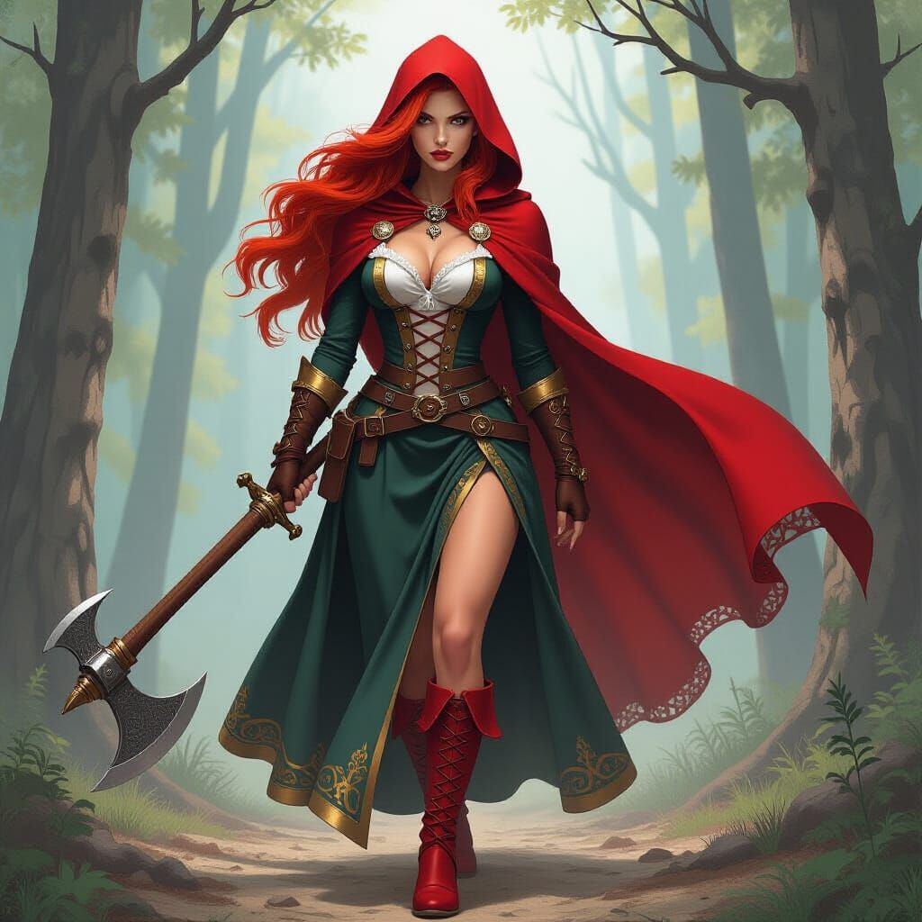 This image shows Red Riding Hood with fiery red hair, a gold-trimmed dress, and red boots, armed with a sword and axe. The art style blends dynamic fantasy with futuristic and mythical illustration elements.