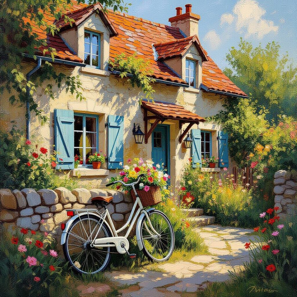 This image shows a quaint, ivy-covered cottage in an overgrown garden, featuring wildflowers spilling over stone walls and a vintage bicycle. Rendered in a painterly impasto style with soft, golden hour light, it evokes nostalgia and tranquility.
