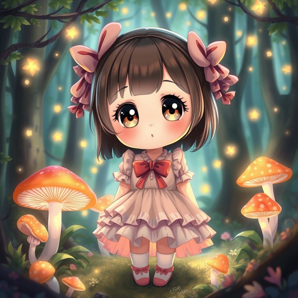 This image depicts a delicate anime girl amidst a mystical forest, surrounded by glowing fungi and fireflies, radiating dreamy charm and vibrant colors.