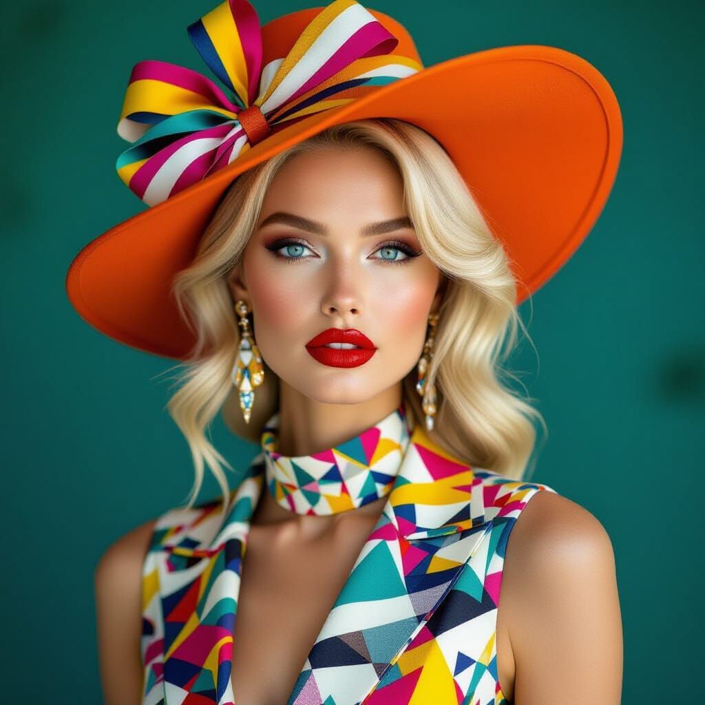 This fashion illustration features an elegant blonde woman in a colorful geometric dress and a unique orange hat. The artwork uses clean lines and bold colors, reminiscent of graphic art styles.