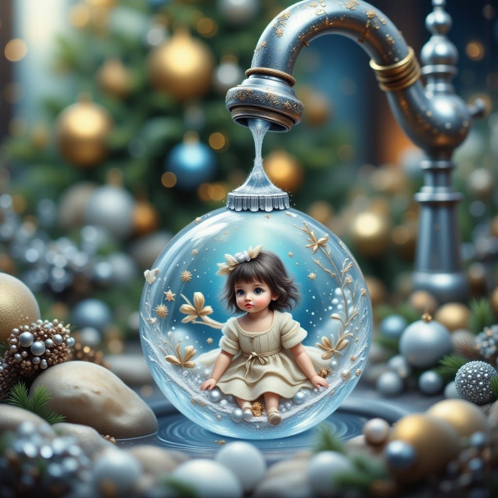 A tiny girl rests inside a clear water droplet hanging from a faucet. This detailed fantasy scene features sparkling textures and soft glowing highlights.