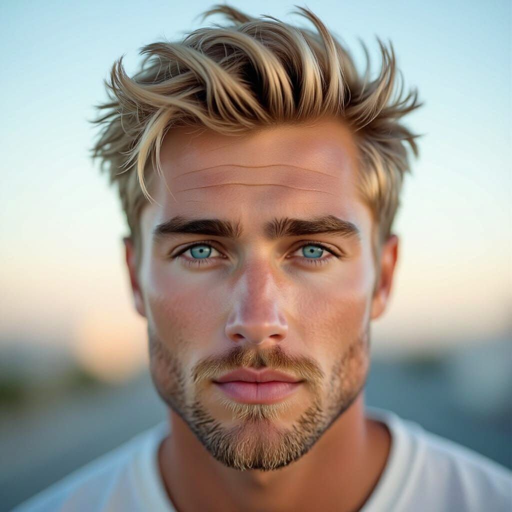 This image captures a realistic young man with blonde, fluffy hair, striking blue eyes, and a medium tan. Presented as a cinematic film still with dramatic lighting and subtle film grain.
