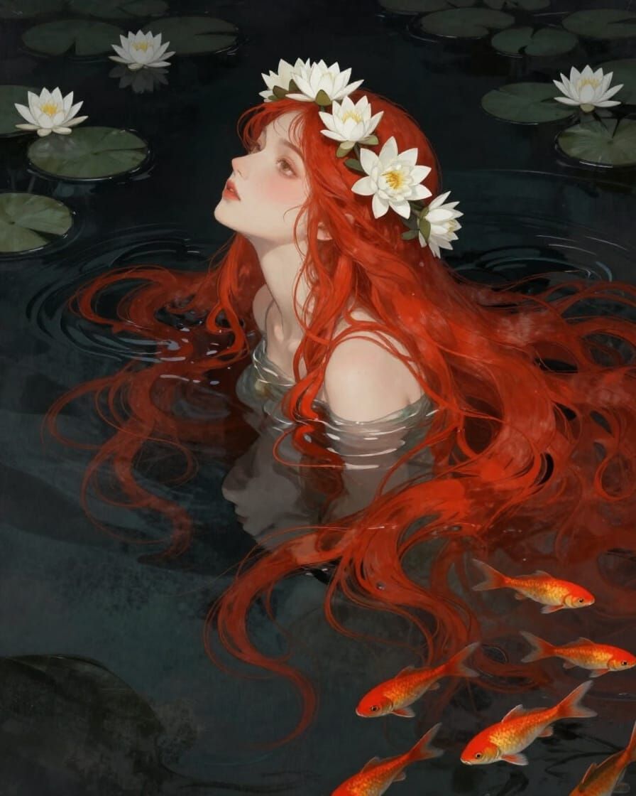 This image depicts an Art Nouveau-style illustration of a woman with flowing red hair, adorned with water lilies, emerging from dark water. Small fish swim nearby, adding to the mystical mood.