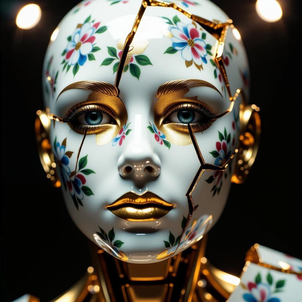 This image features a close-up, realistic portrait of a damaged android with a face made of broken gold porcelain. Rendered with dramatic lighting and deep depth of field.