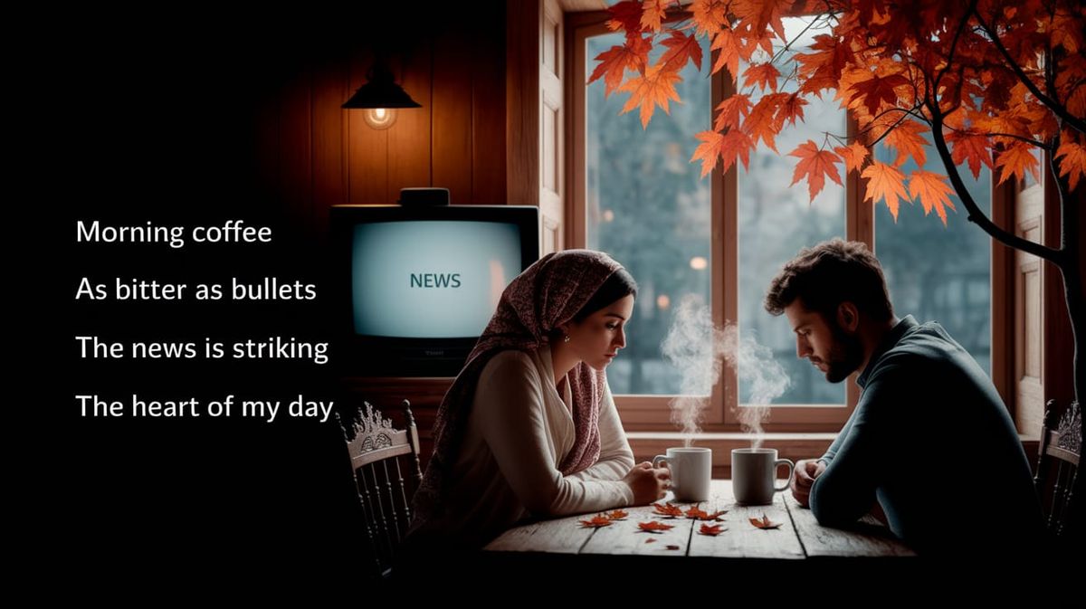 A hyperrealistic, cinematic photo capturing a poignant poem about morning coffee, alongside a contemplative Palestinian couple indoors. An autumn scene with fiery maple leaves is visible through the window, creating a somber yet warm atmosphere.