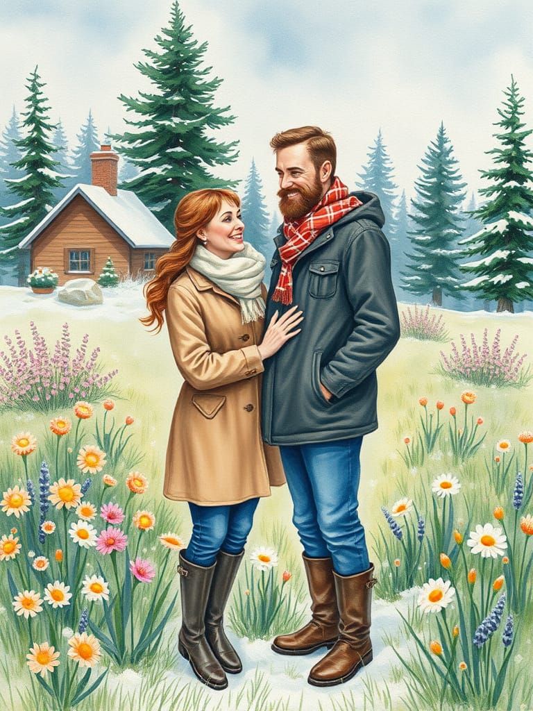 A serene watercolor painting of a happy couple standing in a snowy garden surrounded by pine and green trees, with a house in the background, capturing the essence of a winter wonderland.