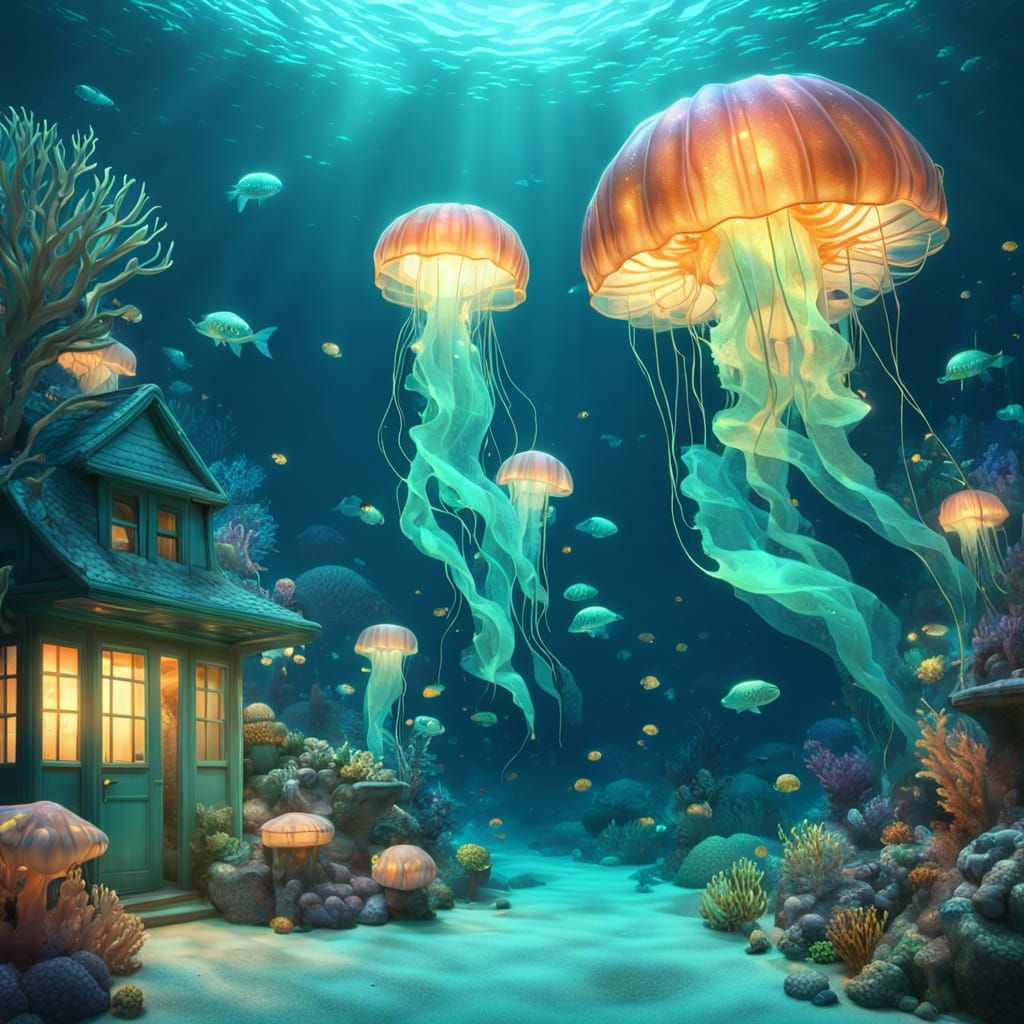 A striking picture of a glowing underwater city nestled in coral reefs. The bioluminescent art style uses vibrant blue-green hues and softly glowing jellyfish lanterns to create a dreamlike atmosphere.