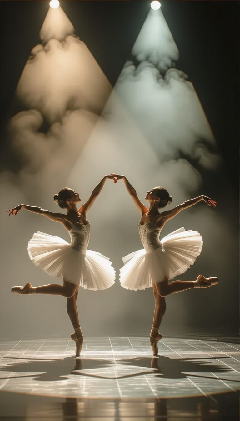 This image shows a pair of ballerinas, one with a cappuccino cup head, performing a grand jeté on a smoky stage. Dramatic shadows and vibrant tones enhance the cinematic photorealism.