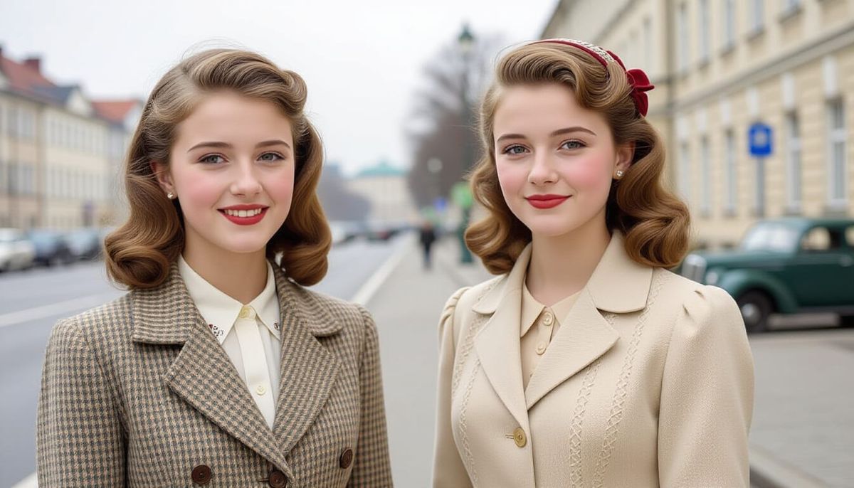 This image shows a beautiful Jewish teenager dressed in 1940s vintage clothing, set against the backdrop of wartime Berlin. The style evokes historical authenticity and solemnity.