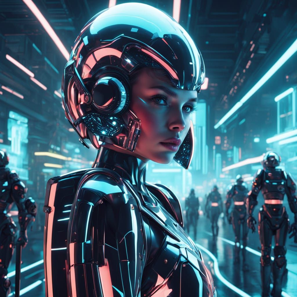 This image shows a woman in futuristic samurai armor holding a katana before a large mech. The scene is lit with neon and holographic elements in a retro-futuristic aesthetic.