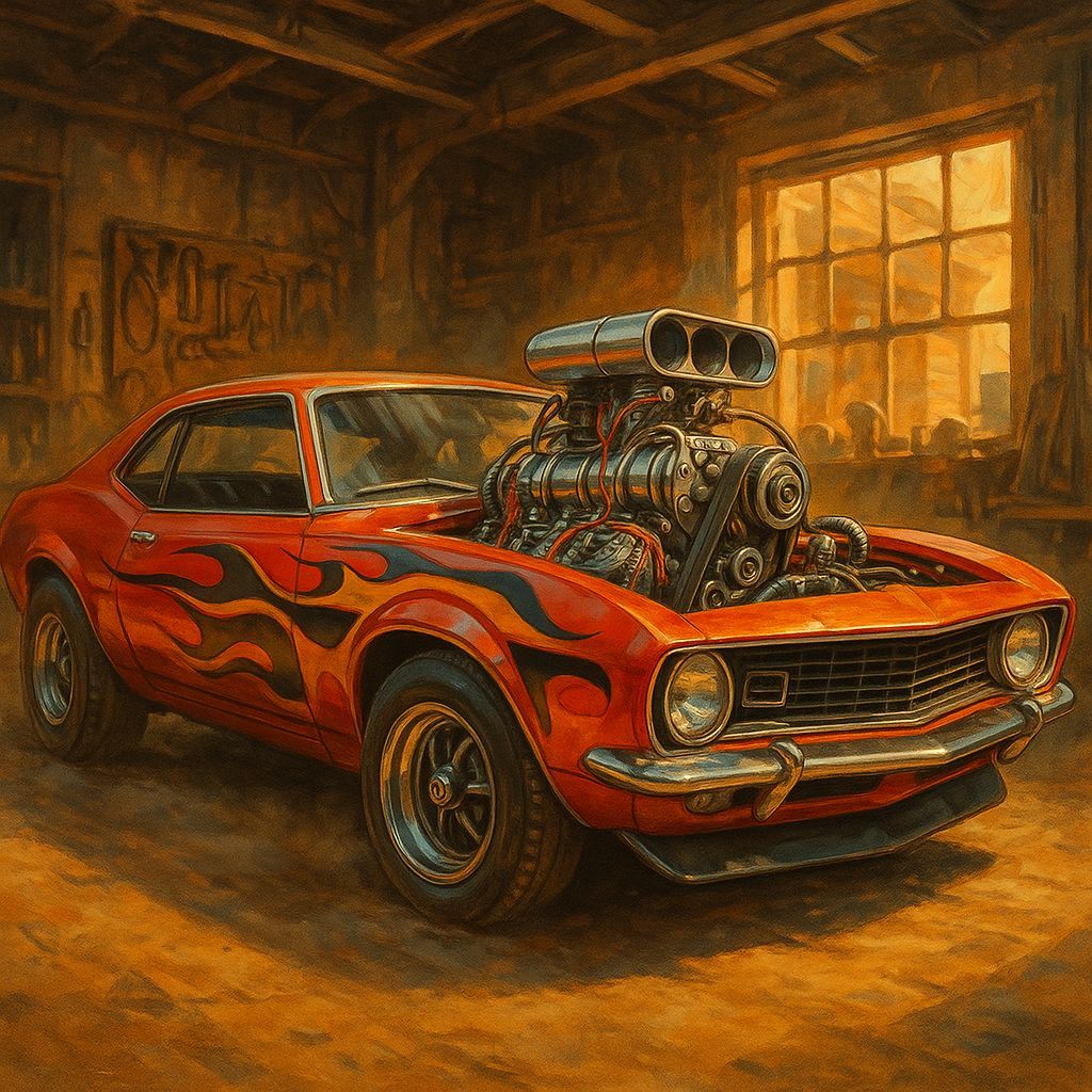 A striking picture of a classic muscle car parked inside a sunlit garage. Chrome details and a bright paint job highlight the vehicle's souped-up engine and retro-futuristic design, reminiscent of vintage hot rod magazine art.